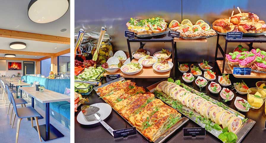 Každé ráno pro Vás s péčí připravujeme bohatý a rozmanitý snídaňový bufet plný chutí, vůní a domácích specialit. Kromě klasických teplých a studených pokrmů si u nás můžete vychutnat i gurmánské speciality – například čerstvě připravené chlebíčky, domácí pomazánky, plněné bagety či domácí dezerty ve skleničkách.