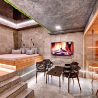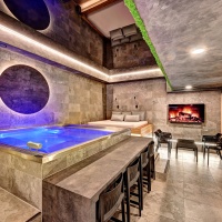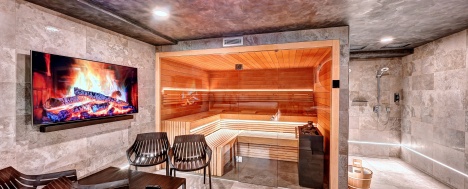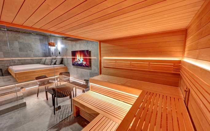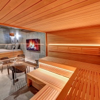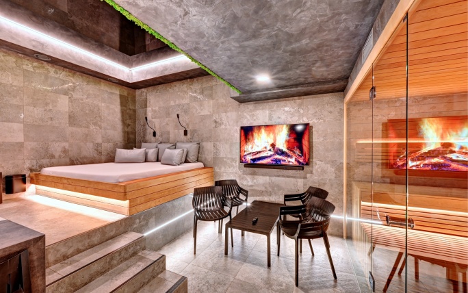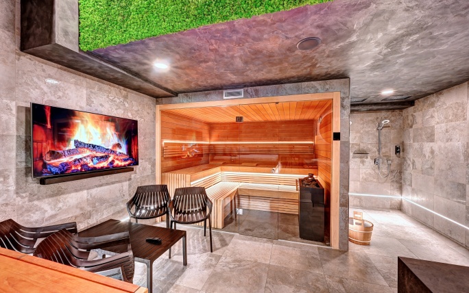 Čeká vás nerezová vířivka, infra sauna se solnou stěnou, relaxační zóna, pohodlné křesla, klimatizace a také finská sauna s možností nastavení teploty podle vašich preferencí – od příjemných 60 °C až po intenzivních 110 °C. Hudbu si pustíte přes tablet ve třech zónách, k dispozici je i televize s přístupem k Netflixu, YouTube, Disney+ a Spotify. Součástí wellness je také samostatná šatna, oddělená sprcha a toaleta. K dispozici je minibar s alko i nealko nápoji a možnost objednat občerstvení i koktejly.