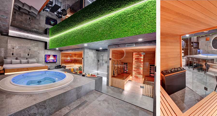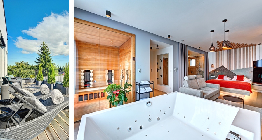 Součástí hotelu je privátní wellness, které si hosté mohou zarezervovat celé pouze pro sebe. K dispozici je vířivka, finská i infra sauna se solnou stěnou, relaxační zóna, amazonské sprchy, pohodlná postel, hudba ovládaná přes tablet a velká televize s online službami.