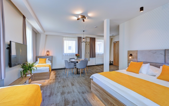 Das Badezimmer ist mit einer Dusche und einem Bluetooth-Audiosystem ausgestattet, sodass Sie Ihre Lieblingsmusik während der Entspannung genießen können. Das Fenster im Badezimmer bietet ebenfalls einen schönen Blick auf Liberec. Mit einem 43"-Fernseher und einem Schreibtisch finden Sie in diesem Zimmer alles, was Sie für einen komfortablen Aufenthalt im zweiten Stock unseres Hotels benötigen.