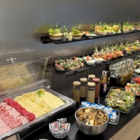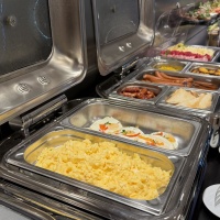 Teplý bufet: párky, smažená vajíčka se slaninou, toasty, palačinky, lívance, vařená vajíčka, smaženky, vaječné omelety, kompoty a mnohé další potraviny, které jsou k dispozici formou bufetu.