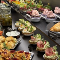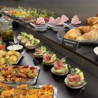 Několik druhů čerstvě krájených salámů a sýrů. Krájená zelenina, ovoce a dezerty.