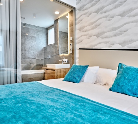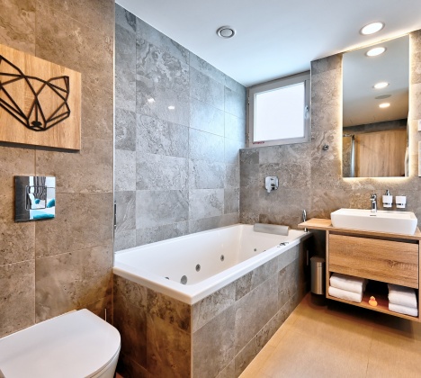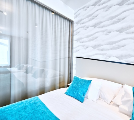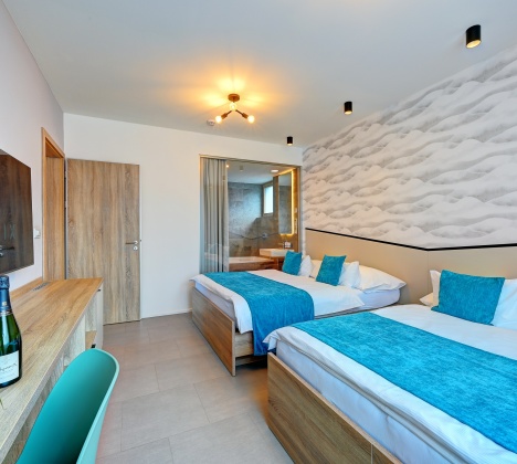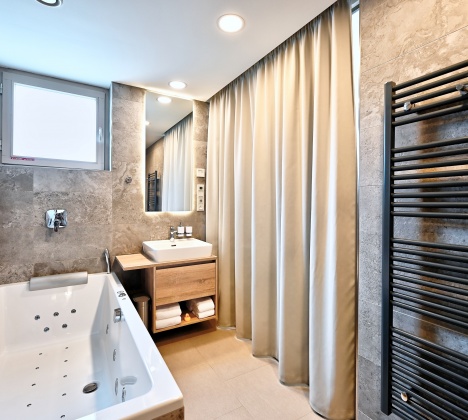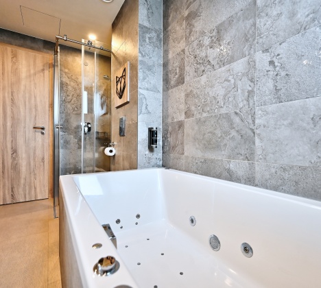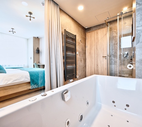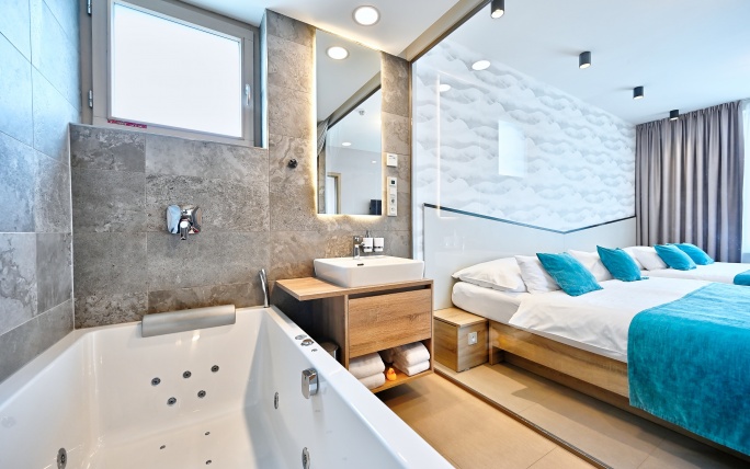 Apartmá Horizont je nejprostornější ze všech. Má velkou ložnici, obývací pokoj a koupelnu vybavenou vířivkou pro dvě osoby, samostatným sprchovým koutem, toaletou, chytrým osvětlením a audiosystémem s Bluetooth. Ložnice je s koupelnou propojena prosklenou stěnou, kterou lze pro větší soukromí zakrýt neprůhledným závěsem.