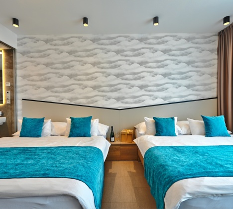Největší předností je ložnice se čtyřmi posuvnými lůžky. Lze je spojit do jedné obří postele, rozdělit na dvě manželské nebo čtyři samostatná lůžka. Díky této variabilitě je Horizont ideální jak pro rodiny s dětmi, tak pro páry, které hledají maximální komfort.