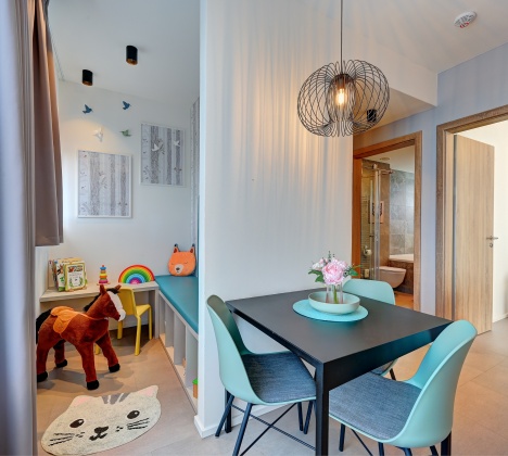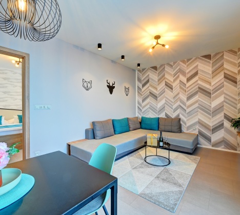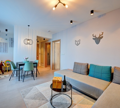 V obývacím pokoji je pohodlná pohovka využitelná i jako přistýlka, jídelní stůl se židlemi a dvě televize – jednu najdete zde, druhou v ložnici. V rohové části obývacího pokoje je dětský koutek, který zabaví menší děti i teenagery.