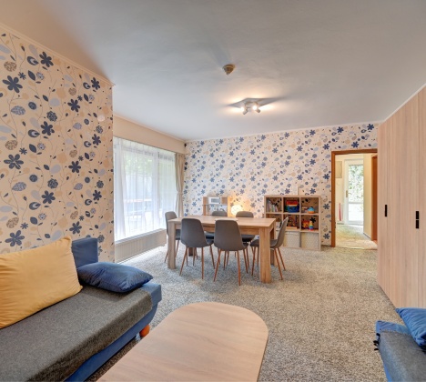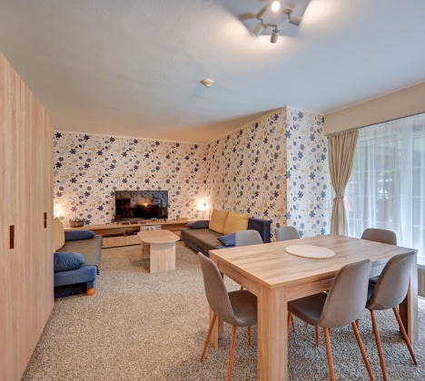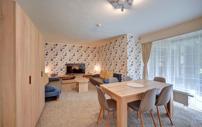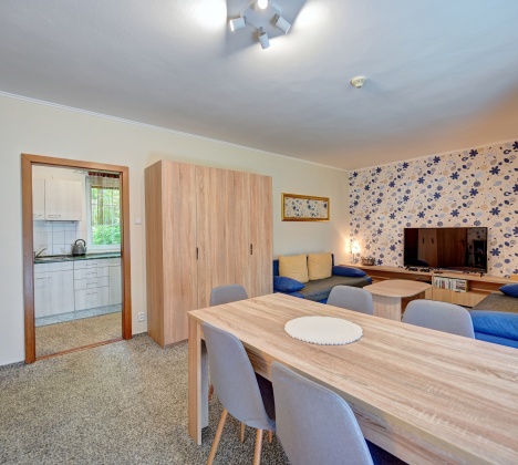 Hlavní částí apartmánu je prostorný obývací pokoj se dvěma rozkládacími pohovkami, které lze snadno proměnit v další čtyři plnohodnotná lůžka. Pro ještě větší komfort jsou vždy vybaveny kvalitním topperem z paměťové pěny. V obývacím pokoji se nachází také velká televize, jídelní stůl pro šest osob a dětský koutek. Z obýváku se vstupuje do vybavené kuchyně s indukčním vařiček, mikrovlnnou troubou a základním nádobím.