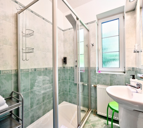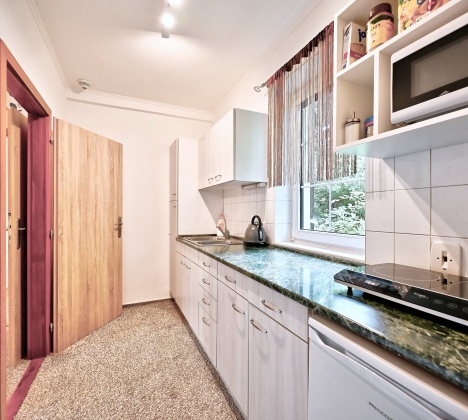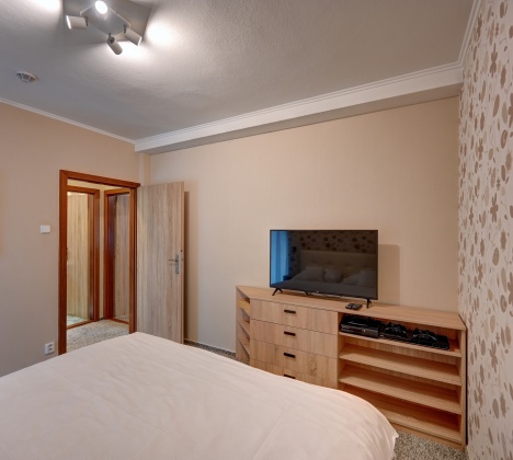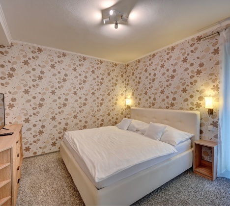 Apartmán Garden se nachází v samostatné budově pouhých 100 metrů od hotelu a nabízí maximální soukromí i dostatek prostoru pro celou rodinu. Má vlastní vchod, ložnici s manželskou postelí o šířce 180 cm a televizí, samostatnou toaletu a koupelnu se sprchovým koutem.