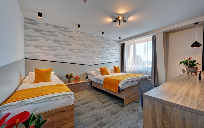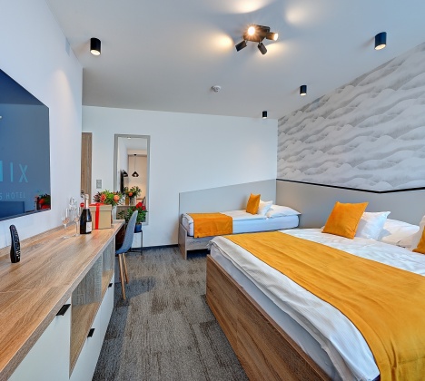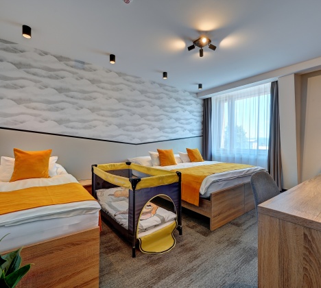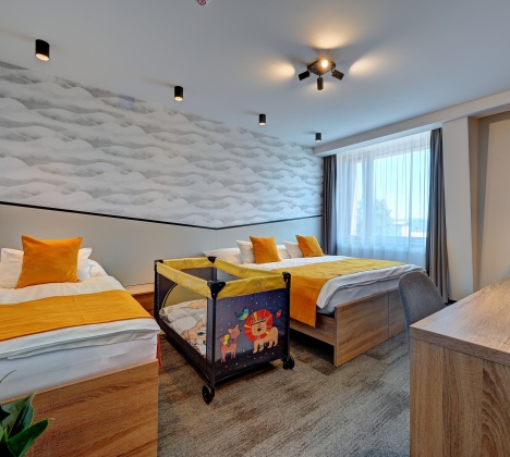 Skyline je prostorný třílůžkový pokoj s variabilním uspořádáním postelí. K dispozici jsou tři posuvná lůžka, která lze spojit do velké rodinné postele, rozdělit na tři samostatná jednolůžka nebo zvolit kombinaci manželské a jednolůžka. Díky své velikosti je možné do pokoje umístit až dvě dětské postýlky. Pokoj je vybaven pracovním stolem se židlí, chytrou televizí, prostornou šatní skříní a zatemňujícími závěsy.