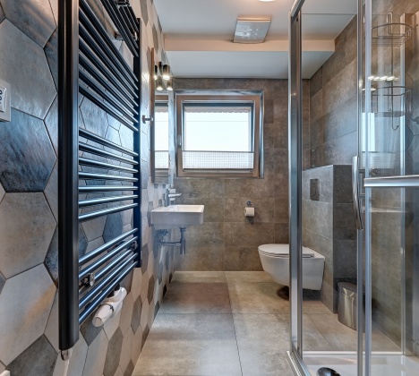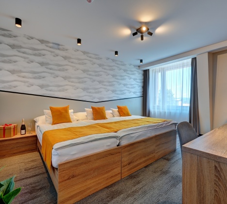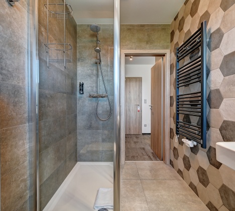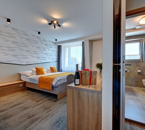 Součástí je koupelna se sprchovým koutem, toaletou a oknem s výhledem na Liberec i Jizerské hory. K dispozici je také audiosystém s Bluetooth pro poslech vlastní hudby. Skyline se nachází ve druhém patře, je dostupný výtahem a patří mezi oblíbené rodinné pokoje u hostů, kteří nepotřebují vířivku, ale ocení prostor a flexibilitu.